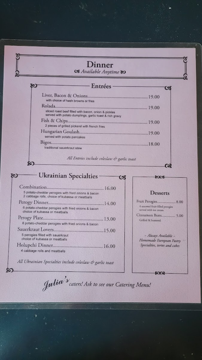 Julia’s Place offers a delightful menu featuring hearty entrees like Liver, Bacon & Onions, Hungarian Goulash, and the ever-popular Fish & Chips, all priced around CA$19. Side orders, such as crispy Onion Rings and comforting Coleslaw, complement each meal perfectly. Notably, the homemade touch shines through in classics like Borscht and Cabbage Rolls, ensuring a taste of home.
